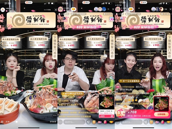 在上海日料自助荣新馆的5号店里,食客们享受着海鲜、刺身、烤物等日料美食,而餐厅的另一边,荣新馆在快手上的直播也在同步进行中。从中午12点开播以来,直播大屏上